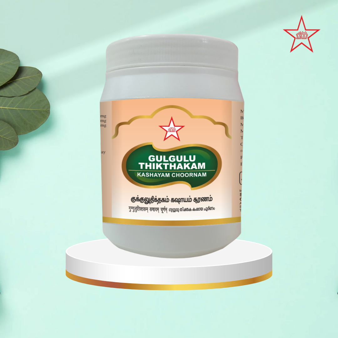 SKM Gulguluthikthakam Kashaya Choornam, offering the therapeutic benefits of the traditional herbal blend in an easy-to-use tablet form . It features key ingredients like Nimba (Neem), Guduchi (Tinospora cordifolia), and Vasa (Adhatoda vasica), known for their skin-supporting, immune-balancing, and gentle anti-inflammatory properties. Additional supportive botanicals include Patola, Vidanga, Pata, and more—historically employed to support digestive wellness, skin clarity, and metabolic equilibrium. Together, this blend supports natural joint comfort, skin wellness, and digestive balance, making it well-suited for individuals seeking a holistic wellness approach. Always use under the guidance of a qualified Ayurvedic practitioner for best results and personalized guidance.